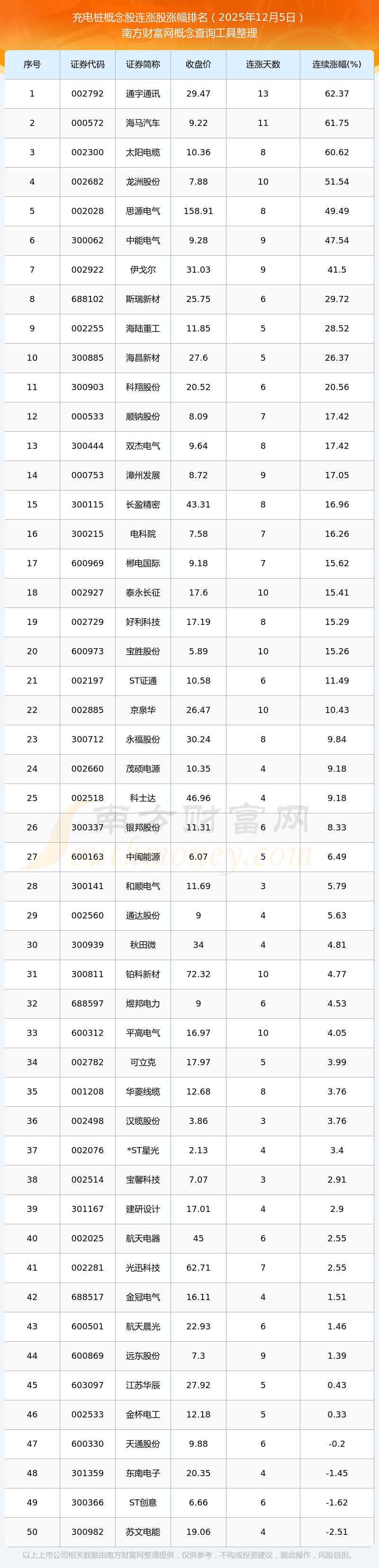 2025年12月5日充電樁概念股連漲股漲幅排名