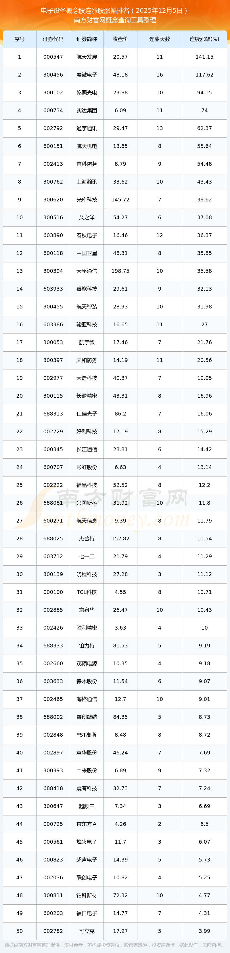 2025年12月5日電子設(shè)備概念股連漲股漲幅排名