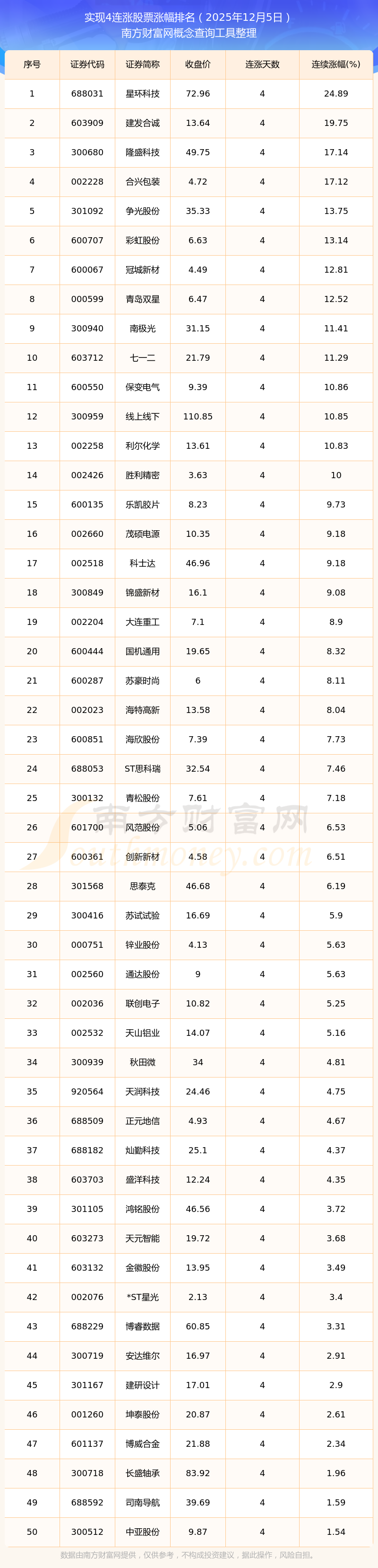 2025年12月5日實(shí)現(xiàn)4連漲股票漲幅排名