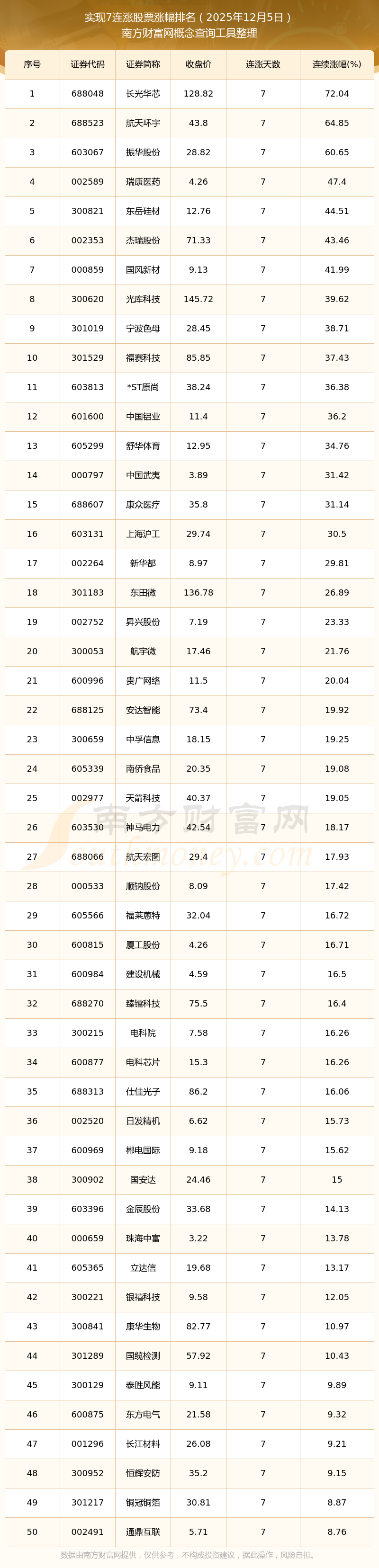 2025年12月5日實(shí)現(xiàn)7連漲股票漲幅排名