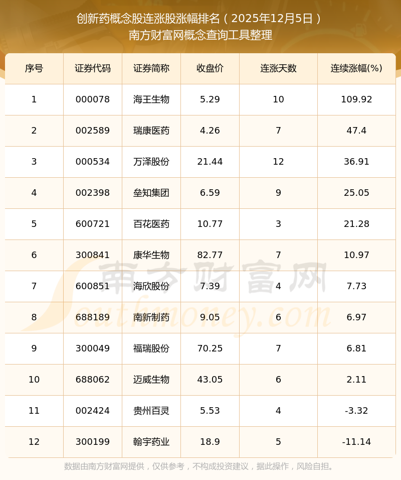 根據(jù)南方財(cái)富網(wǎng)概念查詢工具數(shù)據(jù)統(tǒng)計(jì),截止2025年12月5日收盤,創(chuàng)新藥概念股共有12只個(gè)股實(shí)現(xiàn)連漲。其中連續(xù)漲幅較大的個(gè)股有海王生物、瑞康醫(yī)藥、萬澤股份等,連續(xù)漲幅分別為109.92%、47.40%、36.91%。
