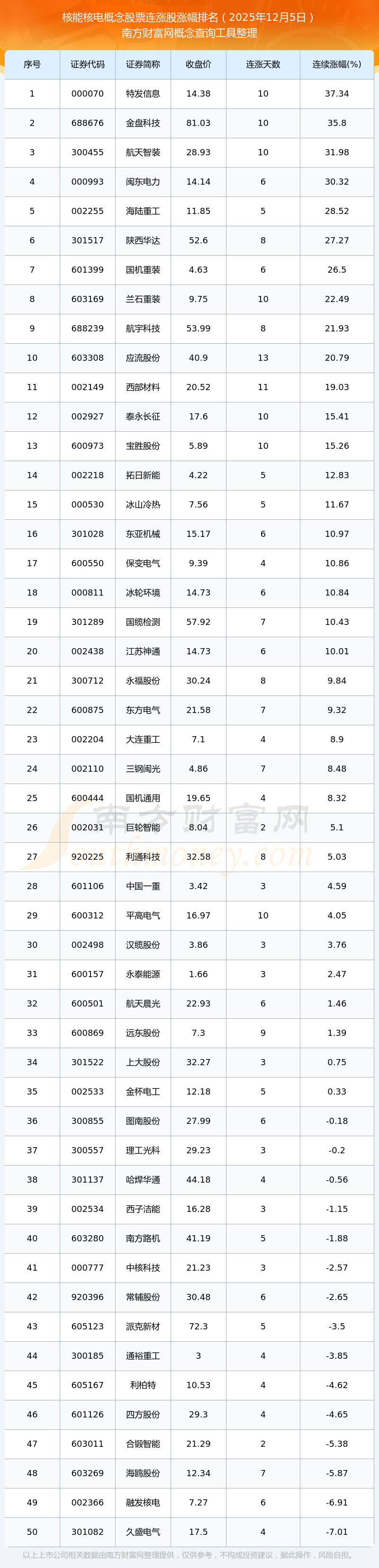 根據(jù)南方財富網(wǎng)概念查詢工具數(shù)據(jù)統(tǒng)計,截止2025年12月5日收盤,核能核電概念股票共有58只個股實現(xiàn)連漲。其中連續(xù)漲幅較大的個股有特發(fā)信息、金盤科技、航天智裝等,連續(xù)漲幅分別為37.34%、35.80%、31.98%。