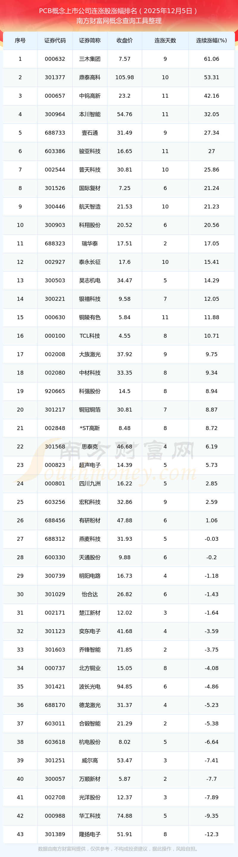 根據(jù)南方財富網(wǎng)概念查詢工具數(shù)據(jù)統(tǒng)計,截止2025年12月5日收盤,PCB概念上市公司共有43只個股實現(xiàn)連漲。其中連續(xù)漲幅較大的個股有三木集團(tuán)、鼎泰高科、中鎢高新等,連續(xù)漲幅分別為61.06%、53.31%、42.16%。