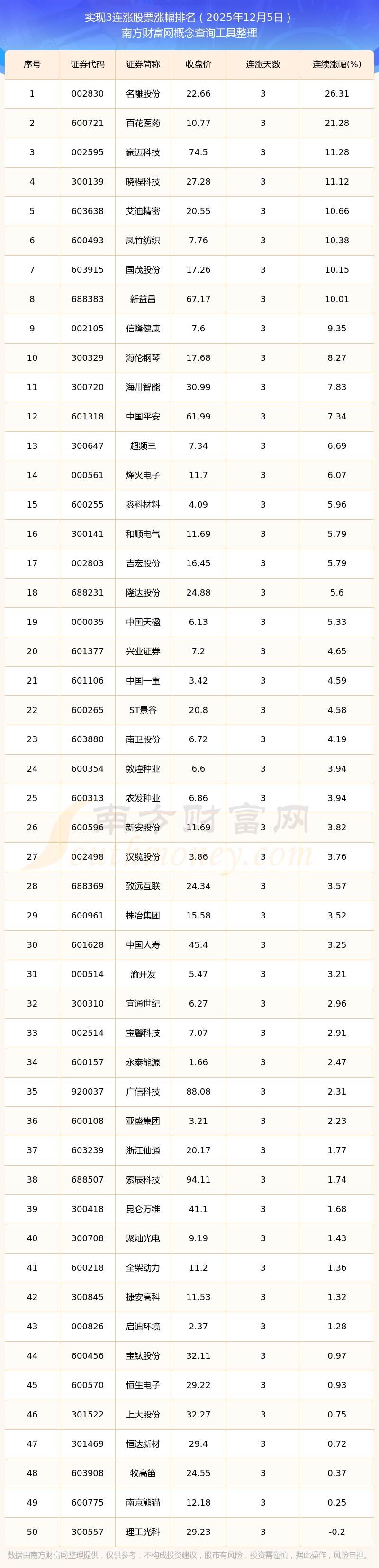 根據(jù)南方財富網(wǎng)概念查詢工具數(shù)據(jù)統(tǒng)計,截止2025年12月5日收盤,共有100只個股實現(xiàn)3天連漲。其中連續(xù)漲幅較大的個股有名雕股份、百花醫(yī)藥、豪邁科技等,連續(xù)漲幅分別為26.31%、21.28%、11.28%。