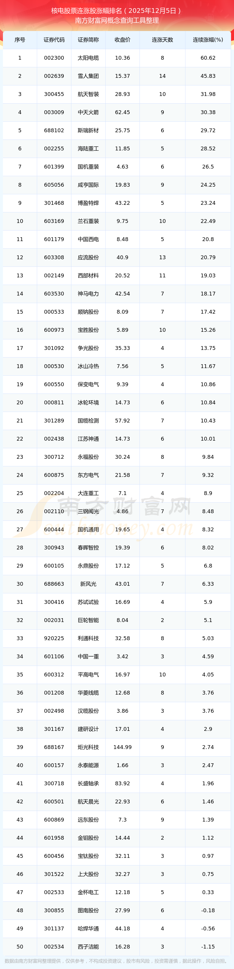 根據(jù)南方財(cái)富網(wǎng)概念查詢工具數(shù)據(jù)統(tǒng)計(jì),截止2025年12月5日收盤,核電股票共有78只個(gè)股實(shí)現(xiàn)連漲。其中連續(xù)漲幅較大的個(gè)股有太陽電纜、雪人集團(tuán)、航天智裝等,連續(xù)漲幅分別為60.62%、45.83%、31.98%。