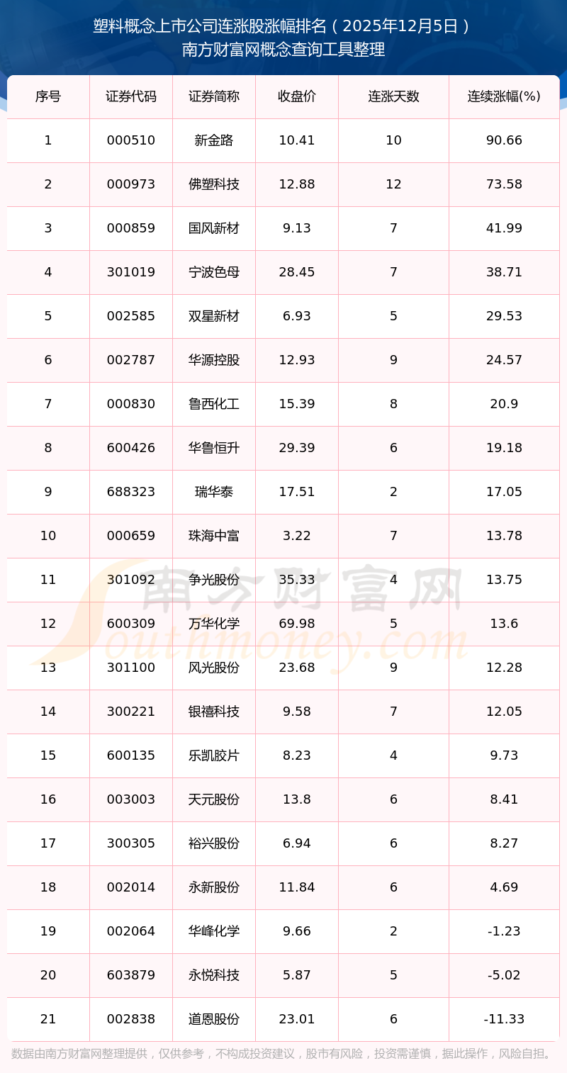 2025年12月5日塑料概念上市公司連漲股漲幅排名
