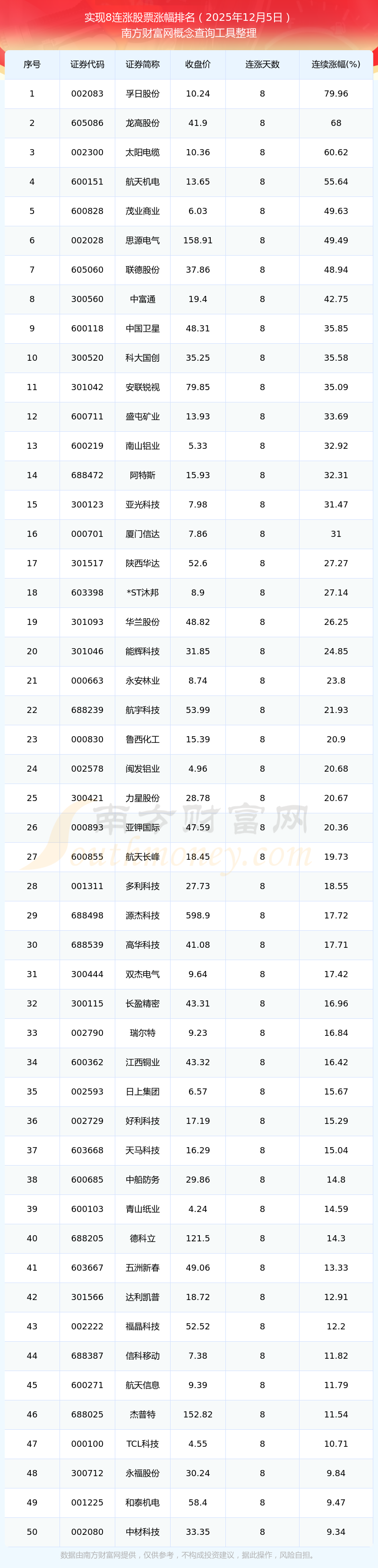 2025年12月5日實(shí)現(xiàn)8連漲股票漲幅排名