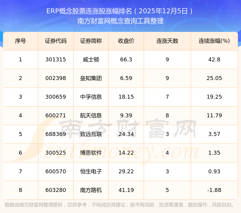 根據南方財富網概念查詢工具數據統(tǒng)計,截止2025年12月5日收盤,ERP概念股票共有8只個股實現連漲。其中連續(xù)漲幅較大的個股有威士頓、壘知集團、中孚信息等,連續(xù)漲幅分別為42.80%、25.05%、19.25%。