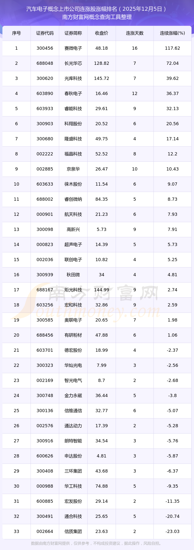 2025年12月5日汽車(chē)電子概念上市公司連漲股漲幅排名