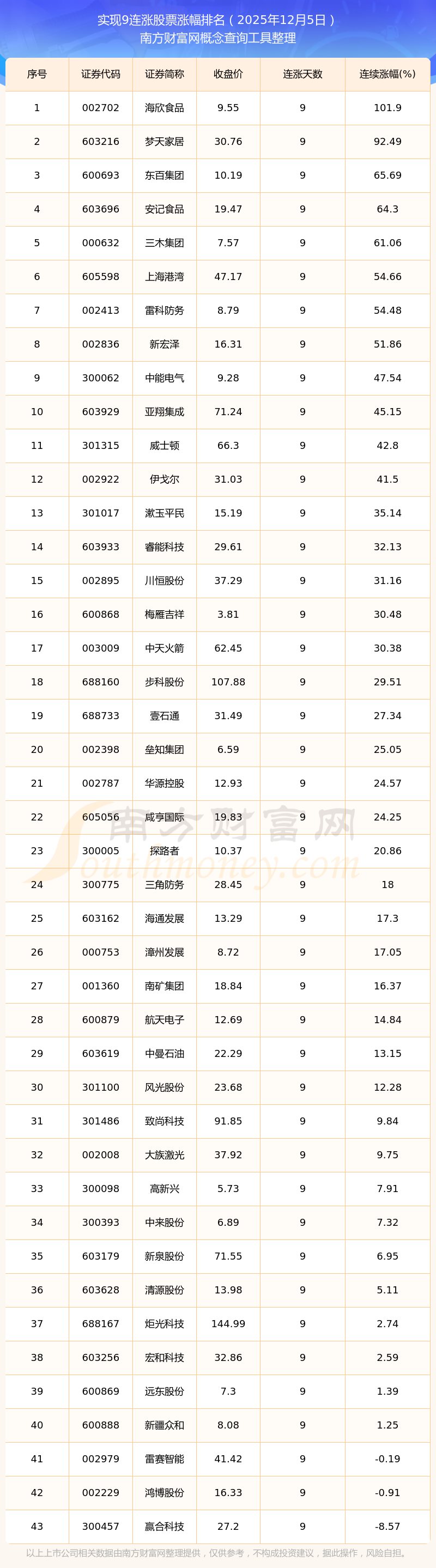 根據(jù)南方財富網(wǎng)概念查詢工具數(shù)據(jù)統(tǒng)計,截止2025年12月5日收盤,共有43只個股實現(xiàn)9天連漲。其中連續(xù)漲幅較大的個股有海欣食品、夢天家居、東百集團等,連續(xù)漲幅分別為101.90%、92.49%、65.69%。