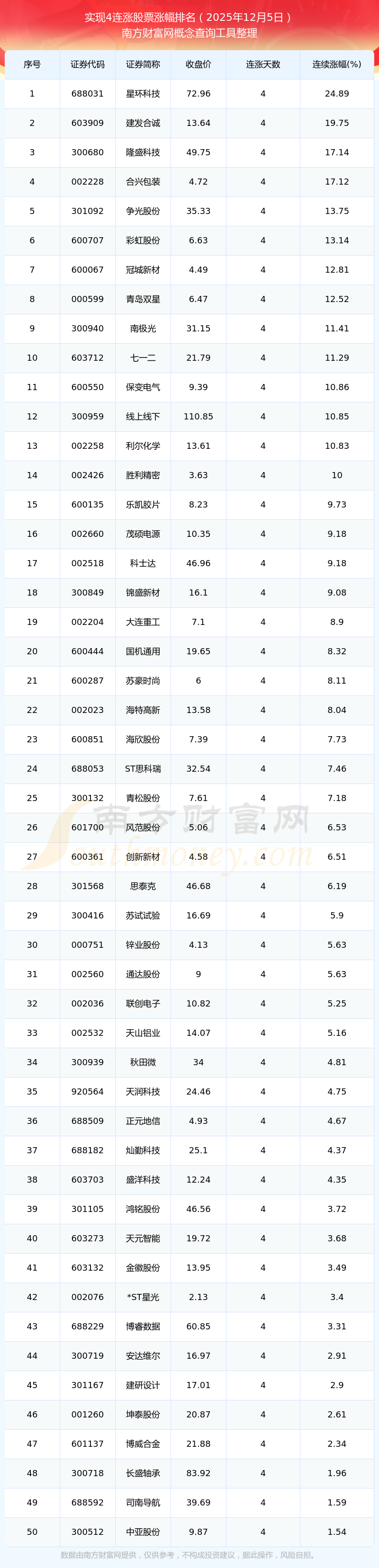 根據(jù)南方財(cái)富網(wǎng)概念查詢工具數(shù)據(jù)統(tǒng)計(jì),截止2025年12月5日收盤(pán),共有119只個(gè)股實(shí)現(xiàn)4天連漲。其中連續(xù)漲幅較大的個(gè)股有星環(huán)科技、建發(fā)合誠(chéng)、隆盛科技等,連續(xù)漲幅分別為24.89%、19.75%、17.14%。