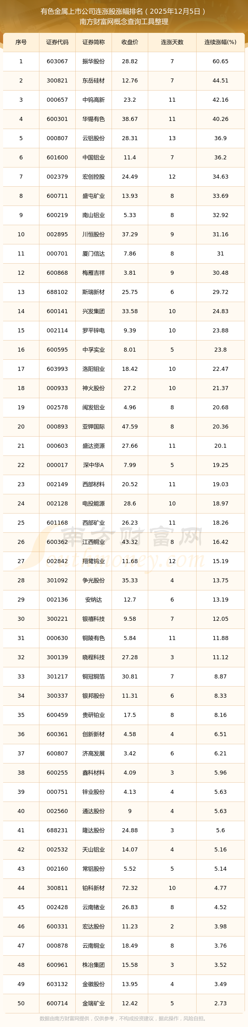 2025年12月5日有色金屬上市公司連漲股漲幅排名