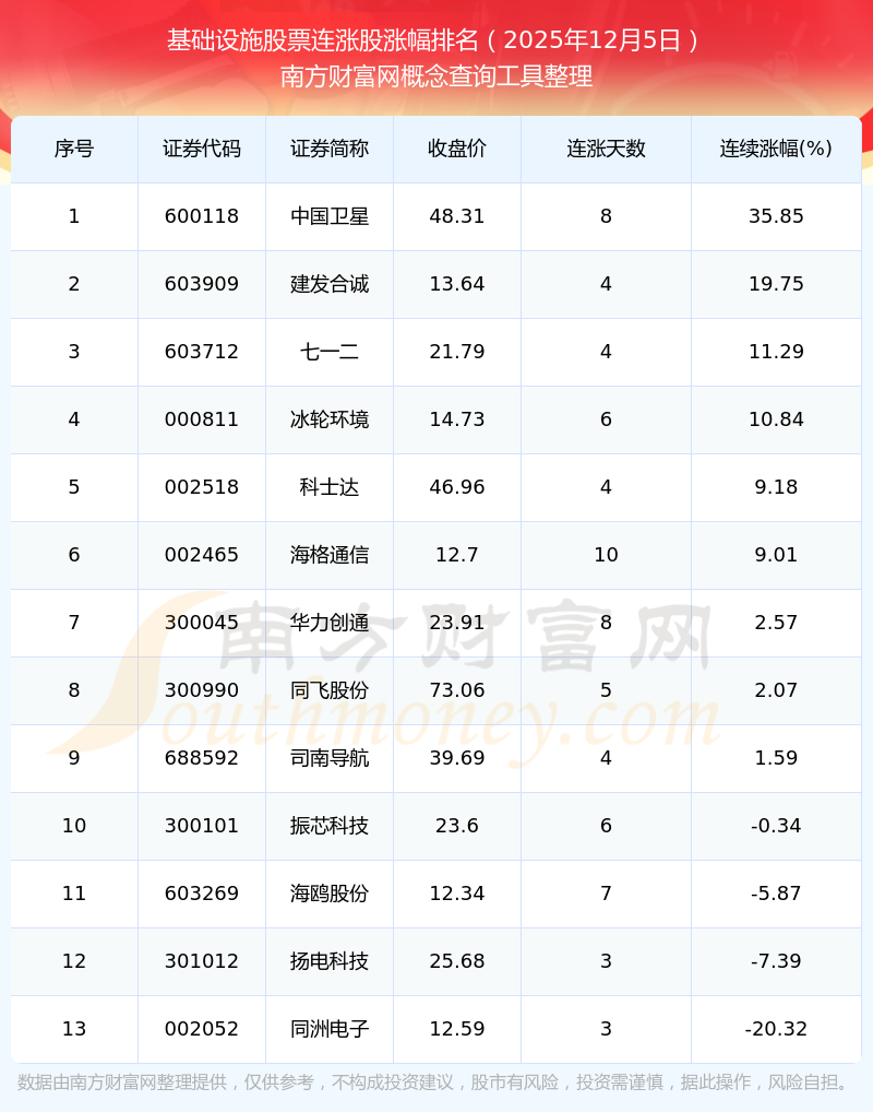 2025年12月5日基礎(chǔ)設(shè)施股票連漲股漲幅排名