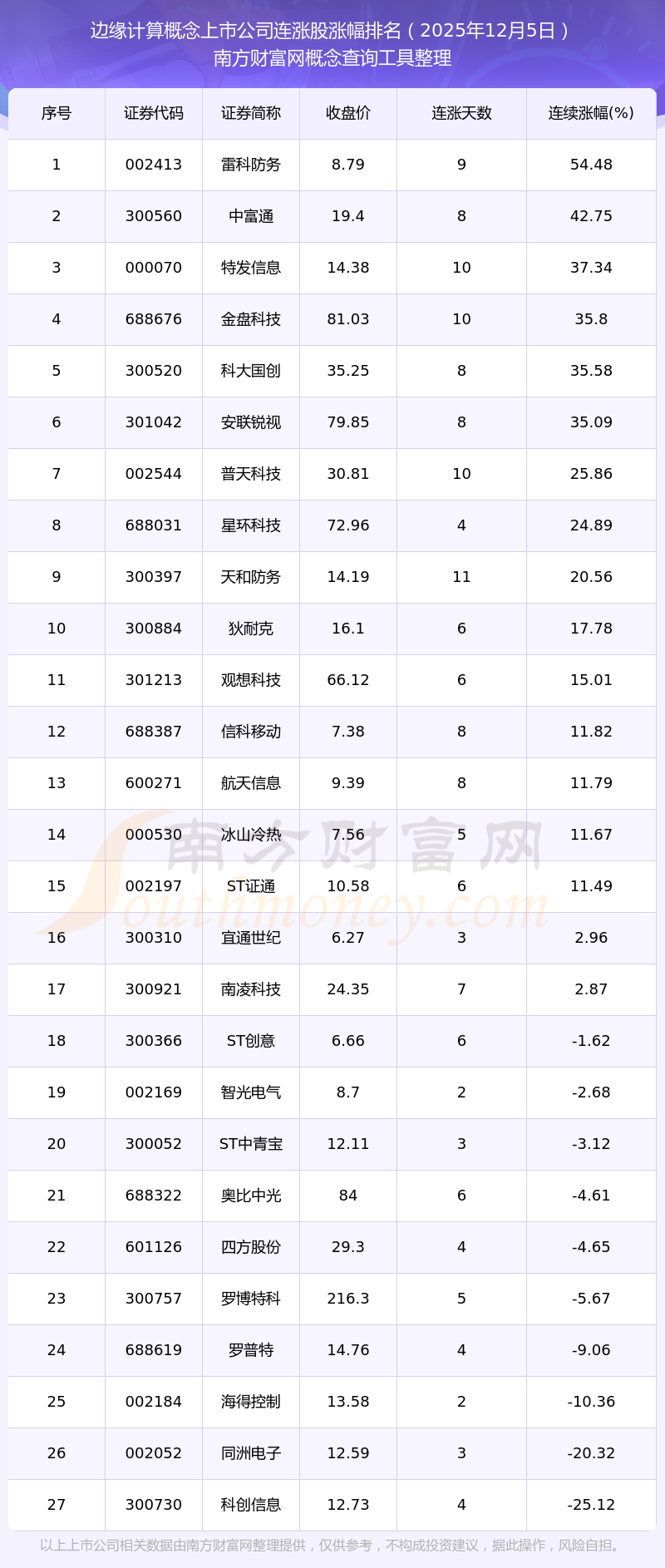 2025年12月5日邊緣計(jì)算概念上市公司連漲股漲幅排名