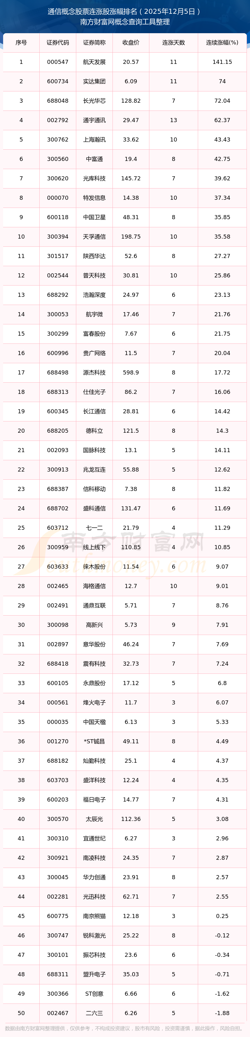 根據南方財富網概念查詢工具數據統(tǒng)計,截止2025年12月5日收盤,通信概念股票共有60只個股實現連漲。其中連續(xù)漲幅較大的個股有航天發(fā)展、實達集團、長光華芯等,連續(xù)漲幅分別為141.15%、74.00%、72.04%。
