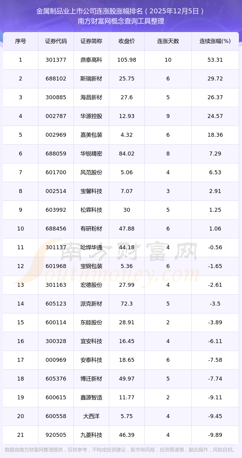 2025年12月5日金屬制品業(yè)上市公司連漲股漲幅排名