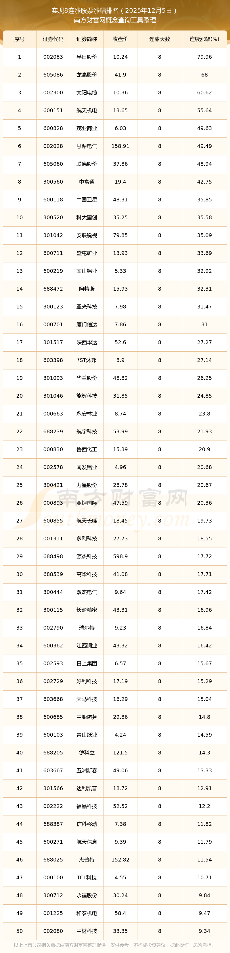 2025年12月5日實現(xiàn)8連漲股票漲幅排名