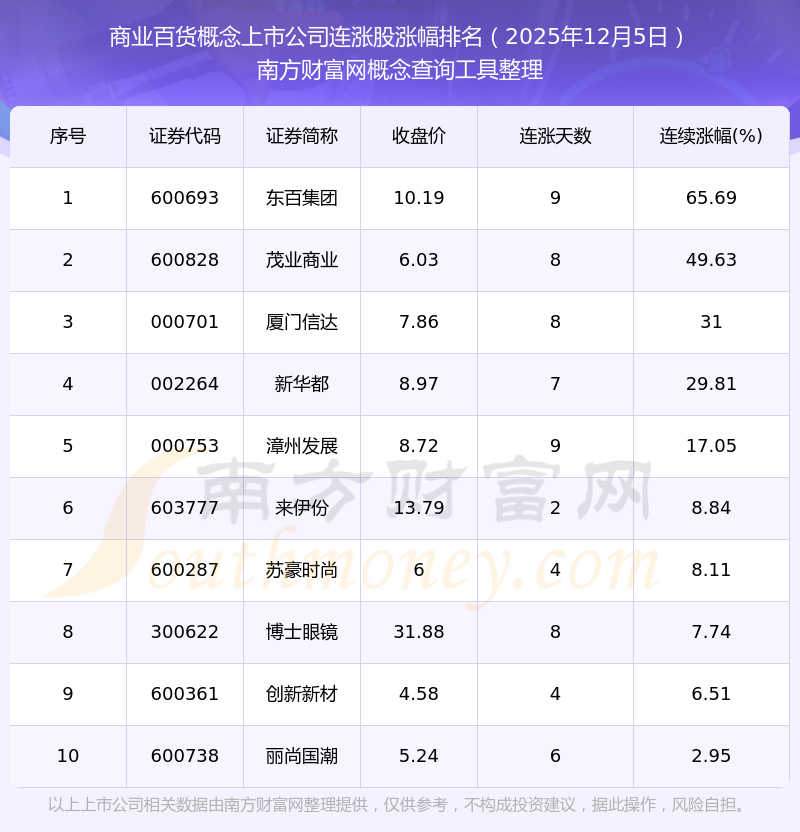 2025年12月5日商業(yè)百貨概念上市公司連漲股漲幅排名