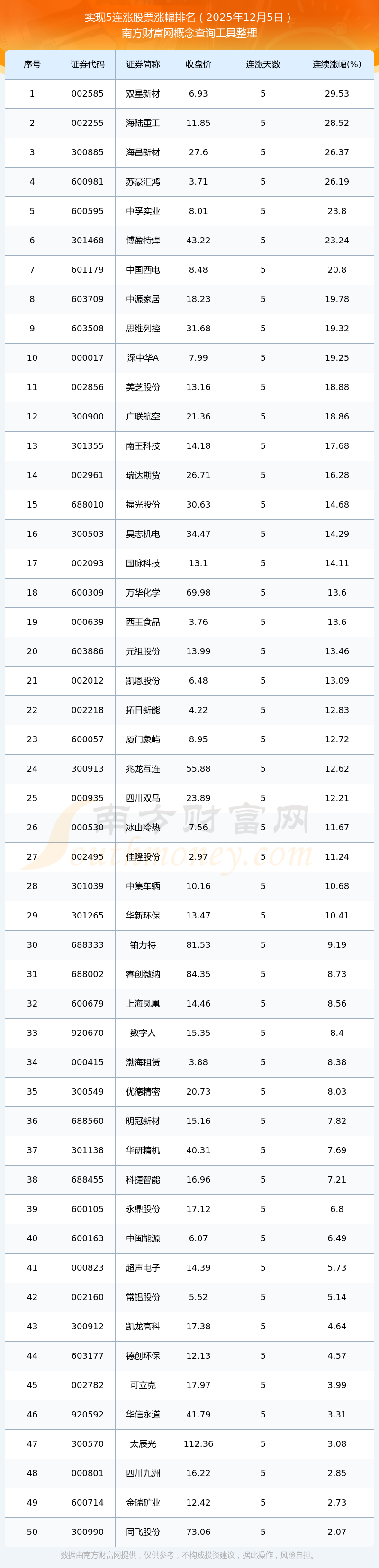 根據(jù)南方財富網(wǎng)概念查詢工具數(shù)據(jù)統(tǒng)計,截止2025年12月5日收盤,共有98只個股實現(xiàn)5天連漲。其中連續(xù)漲幅較大的個股有雙星新材、海陸重工、海昌新材等,連續(xù)漲幅分別為29.53%、28.52%、26.37%。