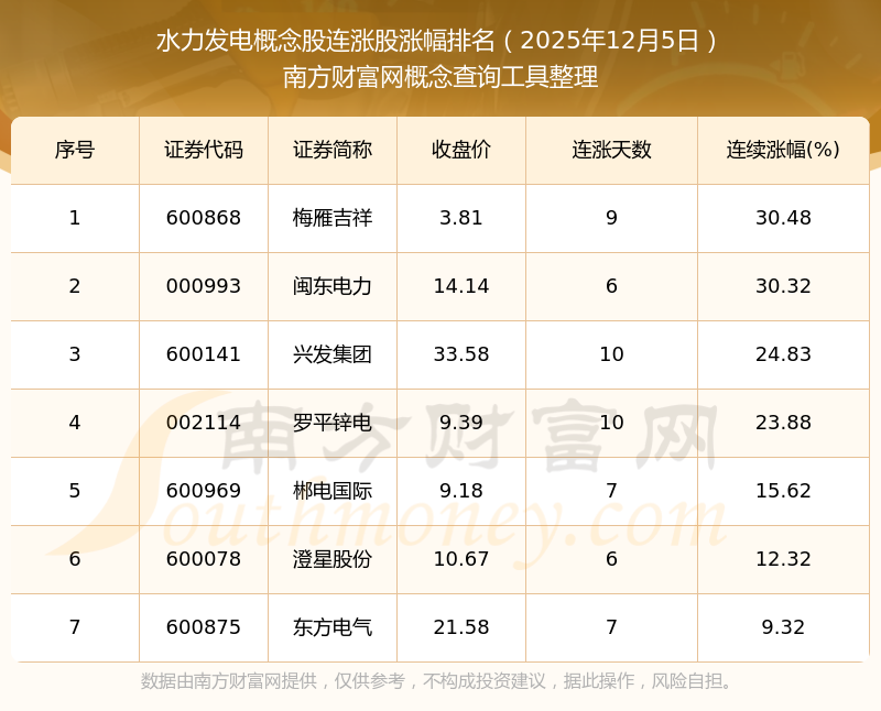根據(jù)南方財富網(wǎng)概念查詢工具數(shù)據(jù)統(tǒng)計,截止2025年12月5日收盤,水力發(fā)電概念股共有7只個股實現(xiàn)連漲。其中連續(xù)漲幅較大的個股有梅雁吉祥、閩東電力、興發(fā)集團(tuán)等,連續(xù)漲幅分別為30.48%、30.32%、24.83%。