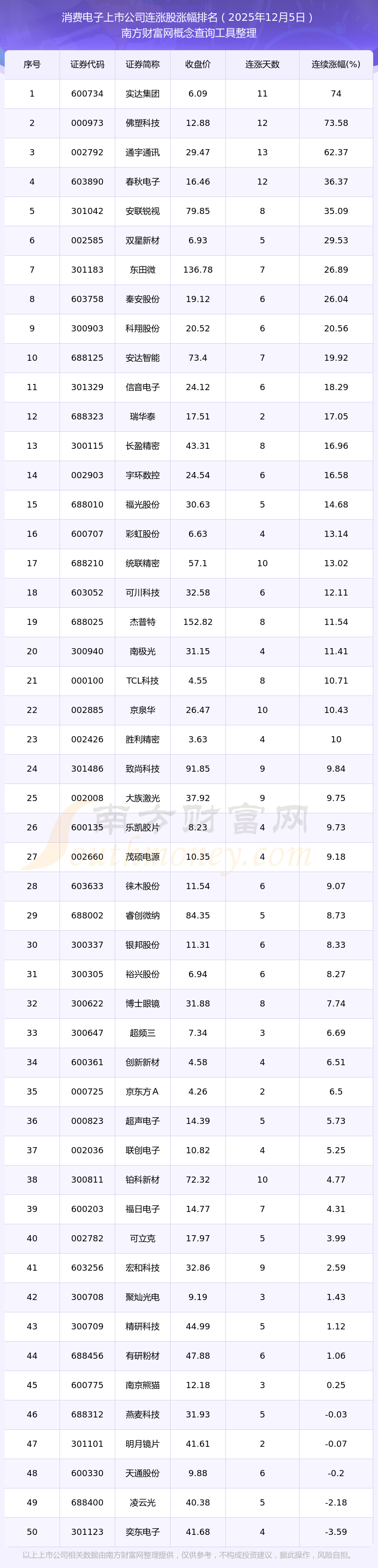 根據(jù)南方財富網(wǎng)概念查詢工具數(shù)據(jù)統(tǒng)計,截止2025年12月5日收盤,消費電子上市公司共有70只個股實現(xiàn)連漲。其中連續(xù)漲幅較大的個股有實達(dá)集團(tuán)、佛塑科技、通宇通訊等,連續(xù)漲幅分別為74.00%、73.58%、62.37%。
