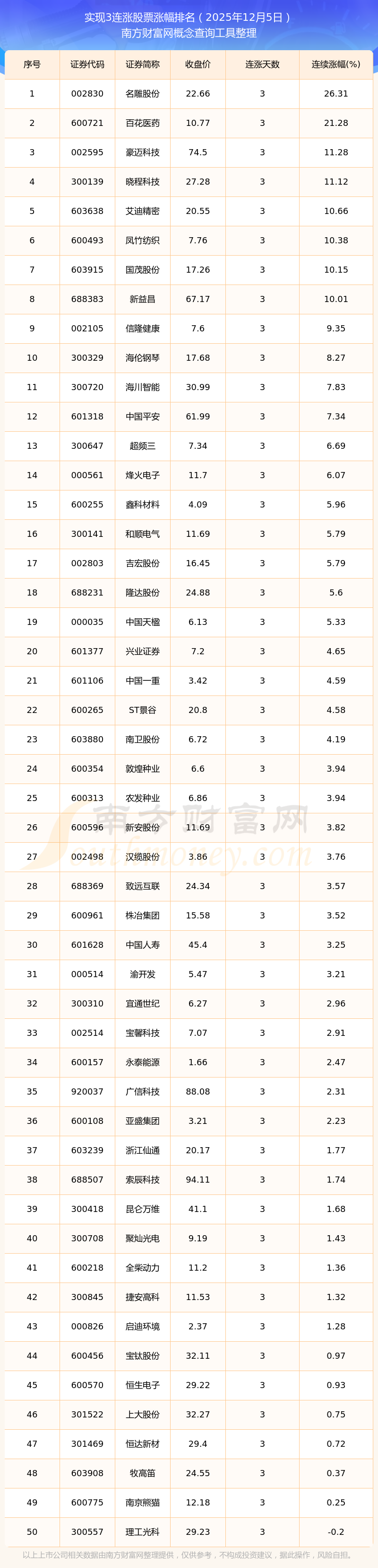 2025年12月5日實(shí)現(xiàn)3連漲股票漲幅排名