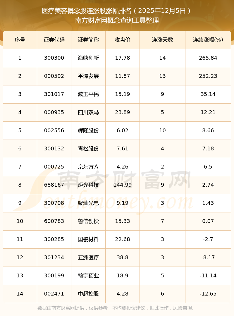 根據(jù)南方財富網(wǎng)概念查詢工具數(shù)據(jù)統(tǒng)計,截止2025年12月5日收盤,醫(yī)療美容概念股共有14只個股實(shí)現(xiàn)連漲。其中連續(xù)漲幅較大的個股有海峽創(chuàng)新、平潭發(fā)展、漱玉平民等,連續(xù)漲幅分別為265.84%、252.23%、35.14%。