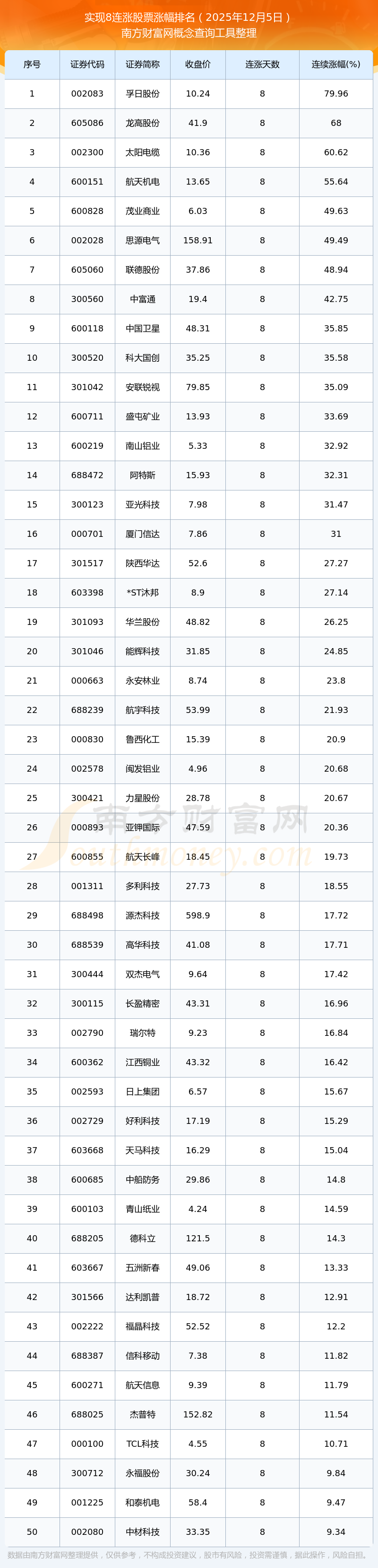 2025年12月5日實現(xiàn)8連漲股票漲幅排名