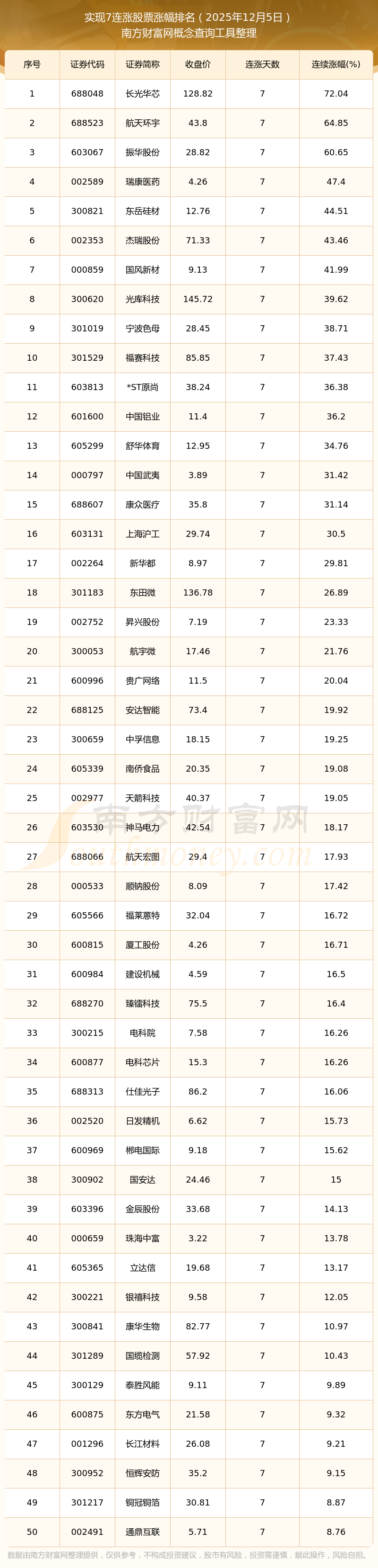 2025年12月5日實(shí)現(xiàn)7連漲股票漲幅排名