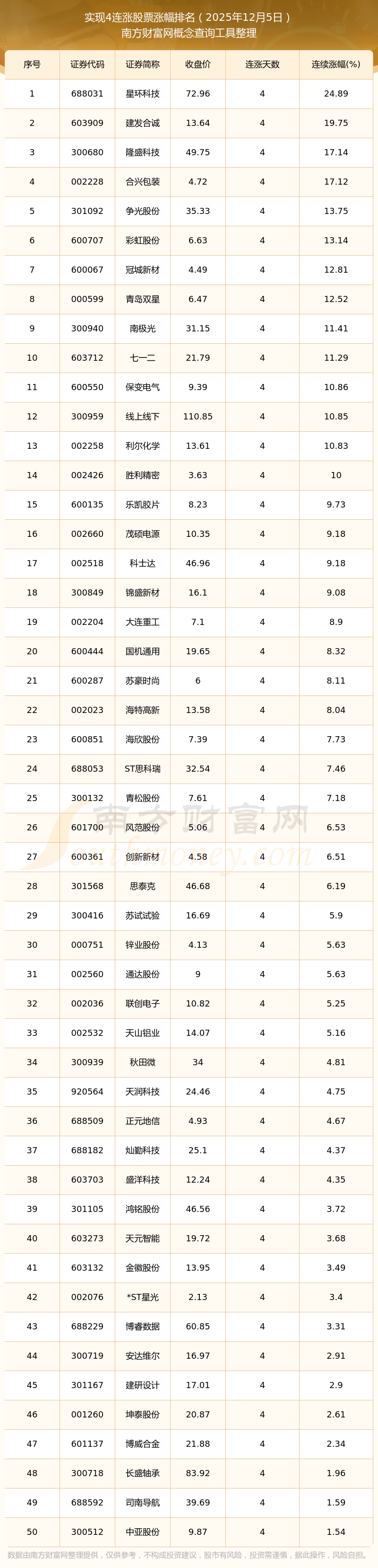 根據(jù)南方財富網(wǎng)概念查詢工具數(shù)據(jù)統(tǒng)計,截止2025年12月5日收盤,共有119只個股實現(xiàn)4天連漲。其中連續(xù)漲幅較大的個股有星環(huán)科技、建發(fā)合誠、隆盛科技等,連續(xù)漲幅分別為24.89%、19.75%、17.14%。