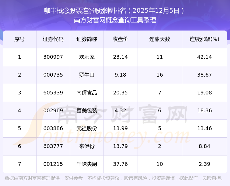 根據(jù)南方財(cái)富網(wǎng)概念查詢工具數(shù)據(jù)統(tǒng)計(jì),截止2025年12月5日收盤,咖啡概念股票共有7只個(gè)股實(shí)現(xiàn)連漲。其中連續(xù)漲幅較大的個(gè)股有歡樂家、羅牛山、南僑食品等,連續(xù)漲幅分別為42.14%、38.67%、19.08%。