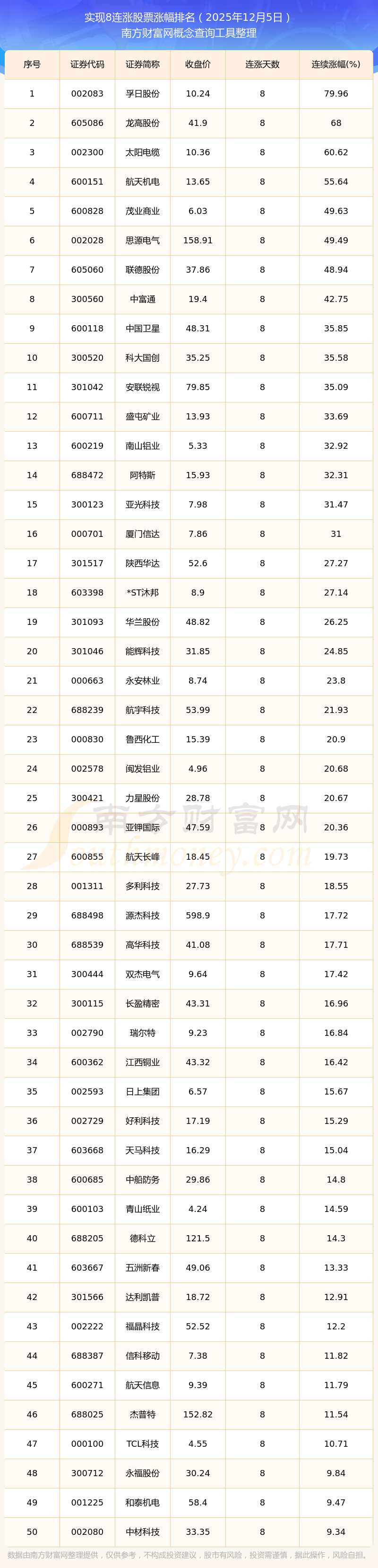 根據(jù)南方財(cái)富網(wǎng)概念查詢工具數(shù)據(jù)統(tǒng)計(jì),截止2025年12月5日收盤,共有75只個(gè)股實(shí)現(xiàn)8天連漲。其中連續(xù)漲幅較大的個(gè)股有孚日股份、龍高股份、太陽(yáng)電纜等,連續(xù)漲幅分別為79.96%、68.00%、60.62%。