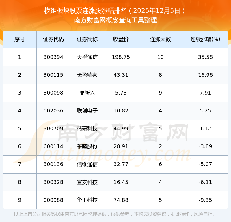 根據(jù)南方財(cái)富網(wǎng)概念查詢工具數(shù)據(jù)統(tǒng)計(jì),截止2025年12月5日收盤,模組板塊股票共有9只個(gè)股實(shí)現(xiàn)連漲。其中連續(xù)漲幅較大的個(gè)股有天孚通信、長(zhǎng)盈精密、高新興等,連續(xù)漲幅分別為35.58%、16.96%、7.91%。