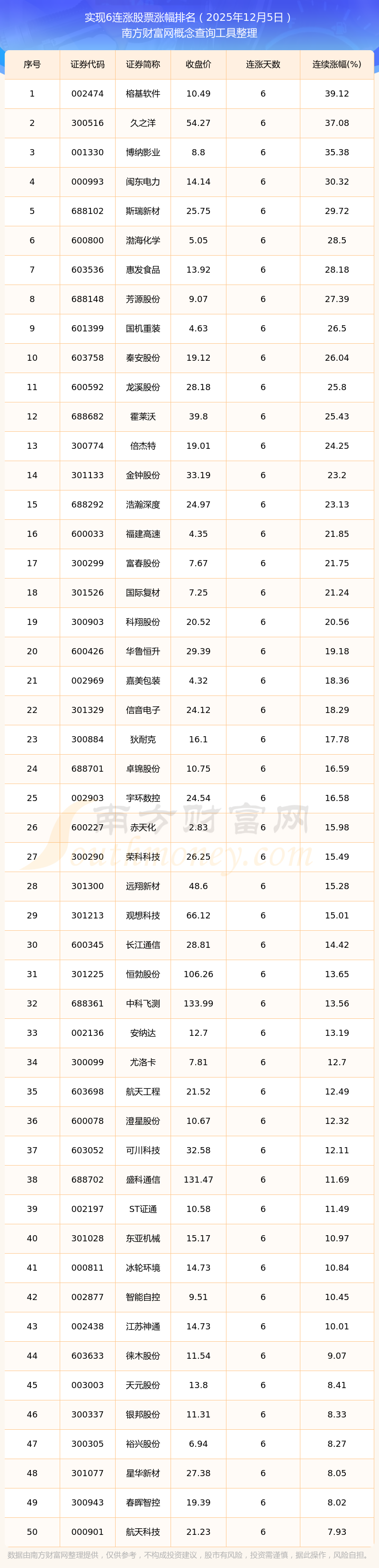 2025年12月5日實(shí)現(xiàn)6連漲股票漲幅排名