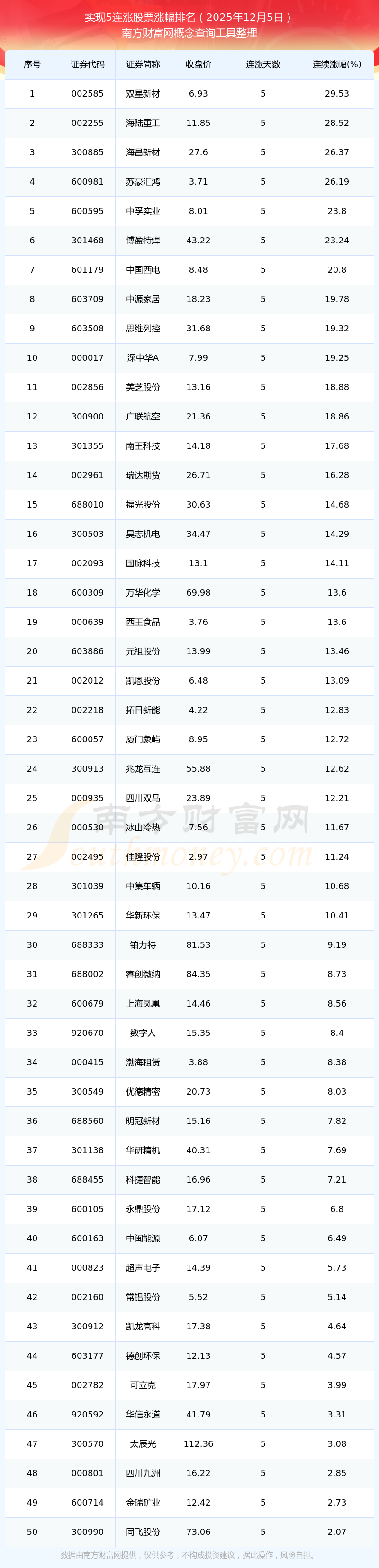 根據(jù)南方財富網(wǎng)概念查詢工具數(shù)據(jù)統(tǒng)計,截止2025年12月5日收盤,共有98只個股實現(xiàn)5天連漲。其中連續(xù)漲幅較大的個股有雙星新材、海陸重工、海昌新材等,連續(xù)漲幅分別為29.53%、28.52%、26.37%。