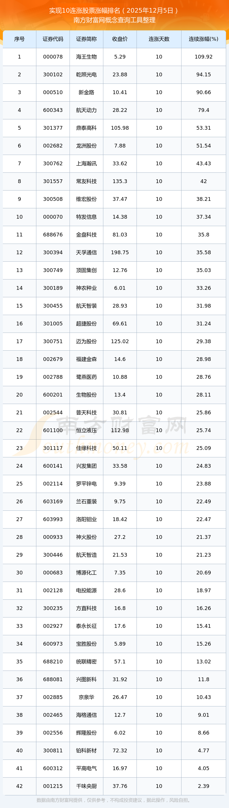 根據(jù)南方財富網(wǎng)概念查詢工具數(shù)據(jù)統(tǒng)計,截止2025年12月5日收盤,共有42只個股實現(xiàn)10天連漲。其中連續(xù)漲幅較大的個股有海王生物、乾照光電、新金路等,連續(xù)漲幅分別為109.92%、94.15%、90.66%。