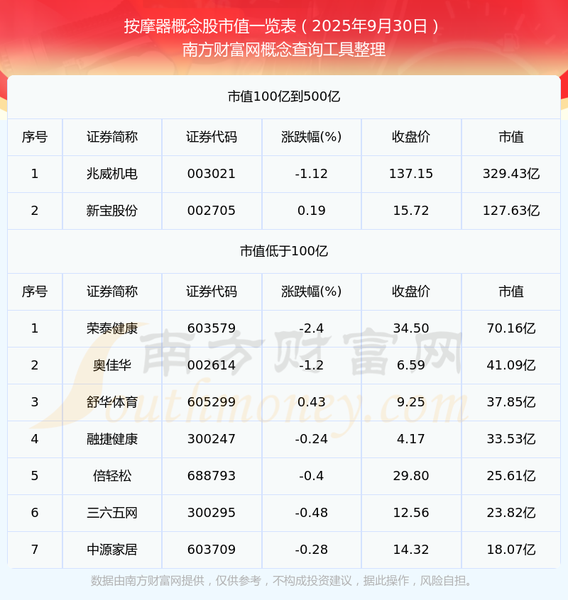 截止2025年9月30日,按摩器概念股中榮泰健康、奧佳華、舒華體育等7家市值位于不足100億之列;兆威機(jī)電和新寶股份市值位于100億到500億之列。