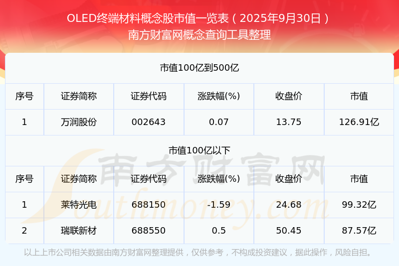 截止2025年9月30日,OLED終端材料概念股中萊特光電和瑞聯(lián)新材市值位于不足100億之列;萬潤股份市值位于100億到500億之列。