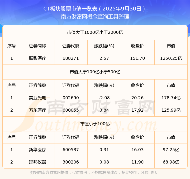 截止2025年9月30日,CT股票中新華醫(yī)療和理邦儀器市值位于不足100億之列;美亞光電和萬東醫(yī)療市值位于100億到500億之列;聯(lián)影醫(yī)療市值位于1000億到2000億之列。