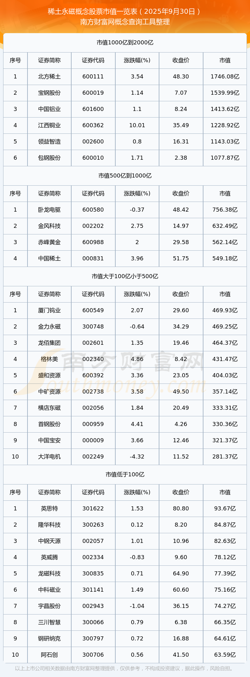 截止2025年9月30日,稀土永磁概念股票中英思特、隆華科技、中鋼天源等37家市值位于不足100億之列;廈門鎢業(yè)、金力永磁、龍佰集團(tuán)、格林美、盛和資源等43家市值位于100億到500億之列;臥龍電驅(qū)、金風(fēng)科技、赤峰黃金、中國稀土等4家市值位于500億到1000億之列;北方稀土、寶鋼股份、中國鋁業(yè)、江西銅業(yè)、領(lǐng)益智造等6家市值位于1000億到2000億之列。