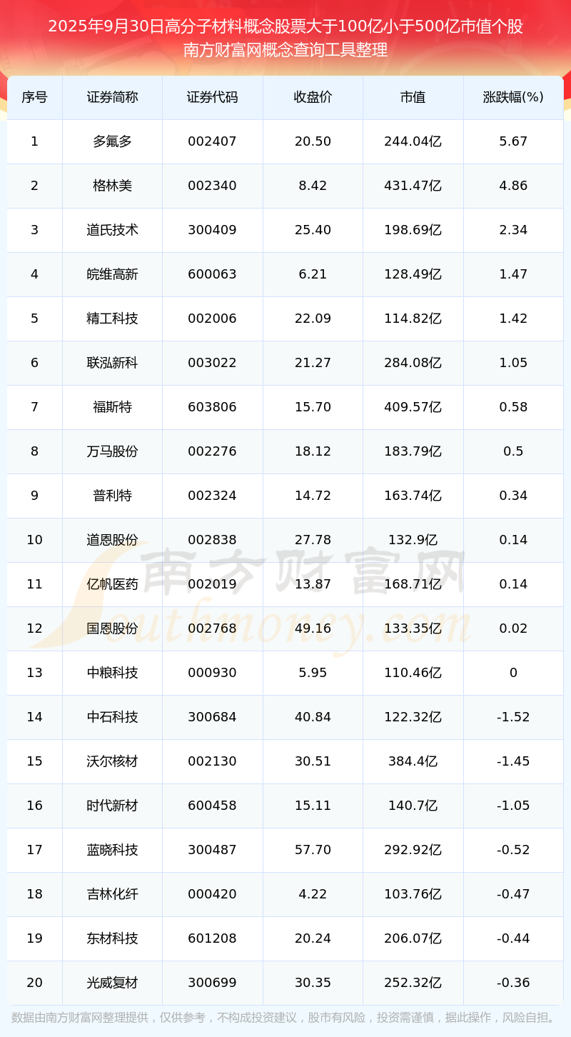 截止2025年9月30日,高分子材料概念股票市值大于100億小于500億的個股共有20只。其中,市值較高的有格林美、福斯特、沃爾核材,市值分別為431.47億元、409.57億元、384.4億元。
