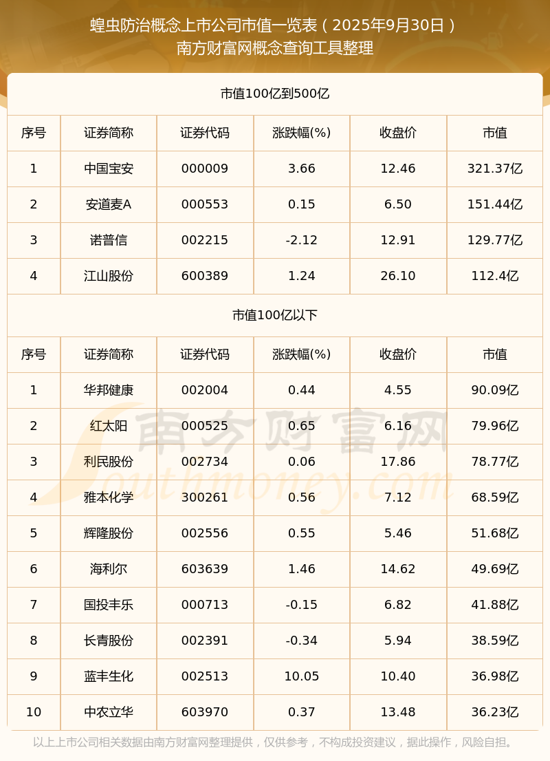截止2025年9月30日,蝗蟲防治概念上市公司中華邦健康、紅太陽、利民股份、雅本化學(xué)等12家市值位于不足100億之列;中國寶安、安道麥A、諾普信等4家市值位于100億到500億之列。