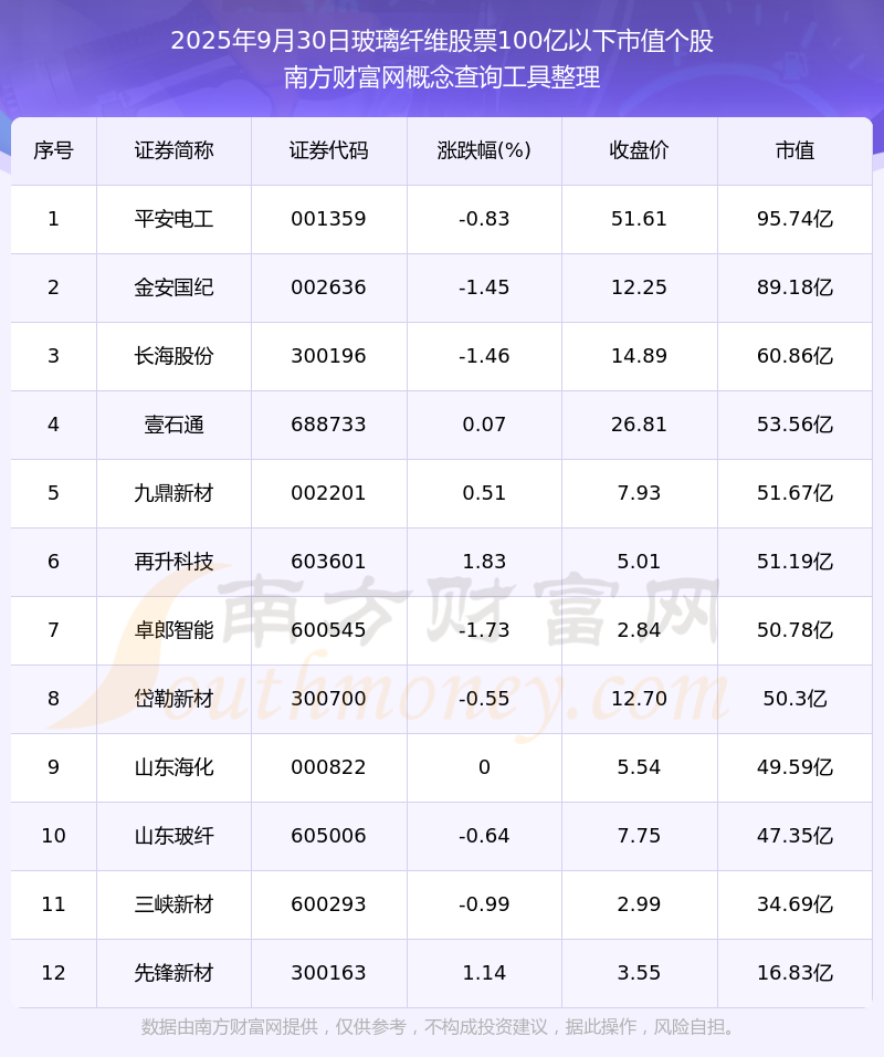 截止2025年9月30日,玻璃纖維股票市值100億以下的個股共有12只。其中,市值較高的有平安電工、金安國紀(jì)、長海股份,市值分別為95.74億元、89.18億元、60.86億元。
