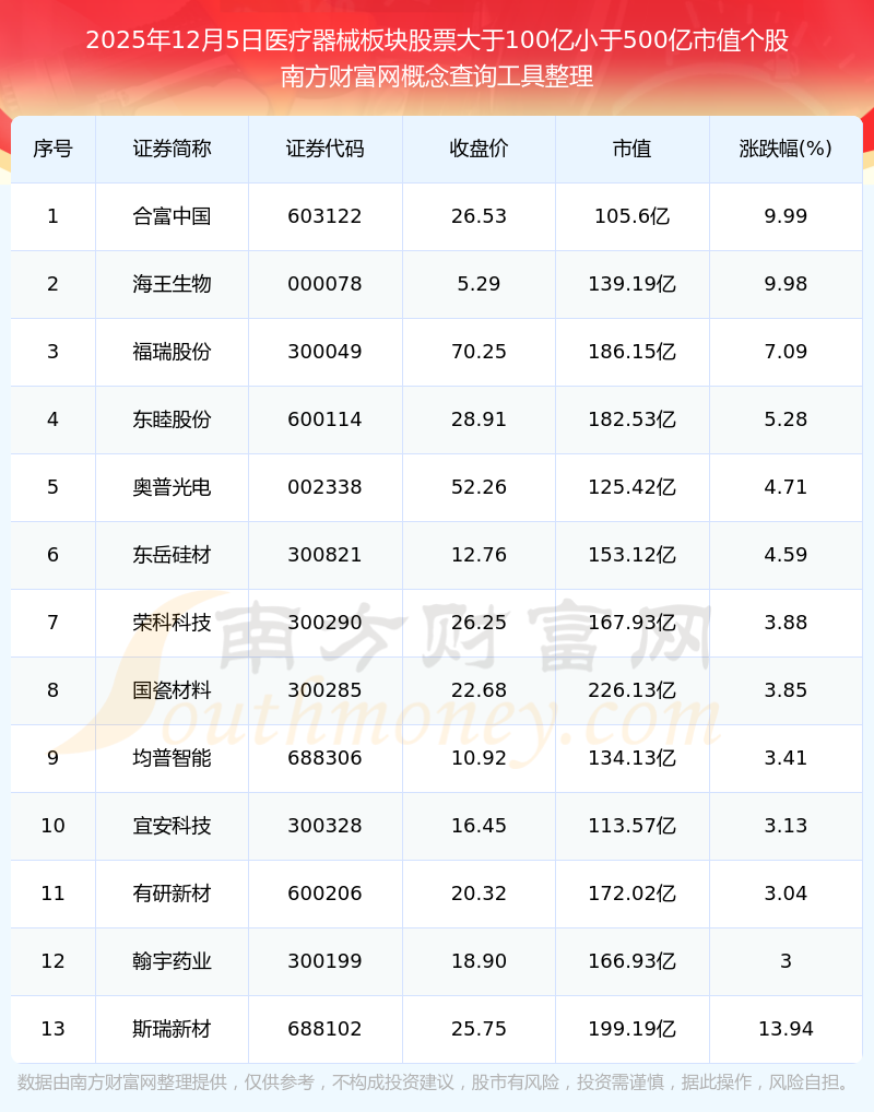 截止2025年12月5日,醫(yī)療器械板塊股票市值大于100億小于500億的個(gè)股共有13只。其中,市值較高的有國瓷材料、斯瑞新材、福瑞股份,市值分別為226.13億元、199.19億元、186.15億元。