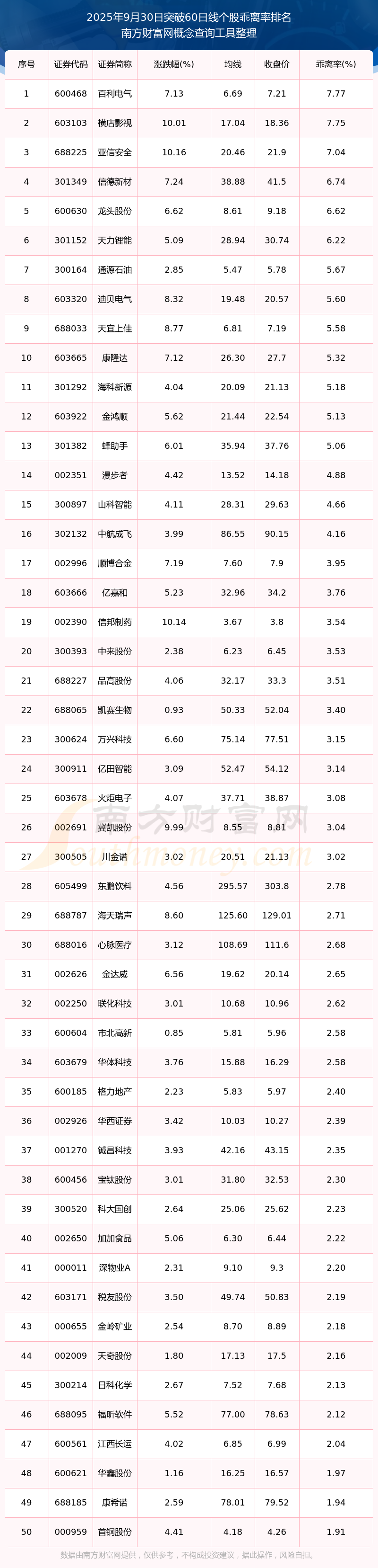 2025年9月30日突破60日線個(gè)股乖離率排名