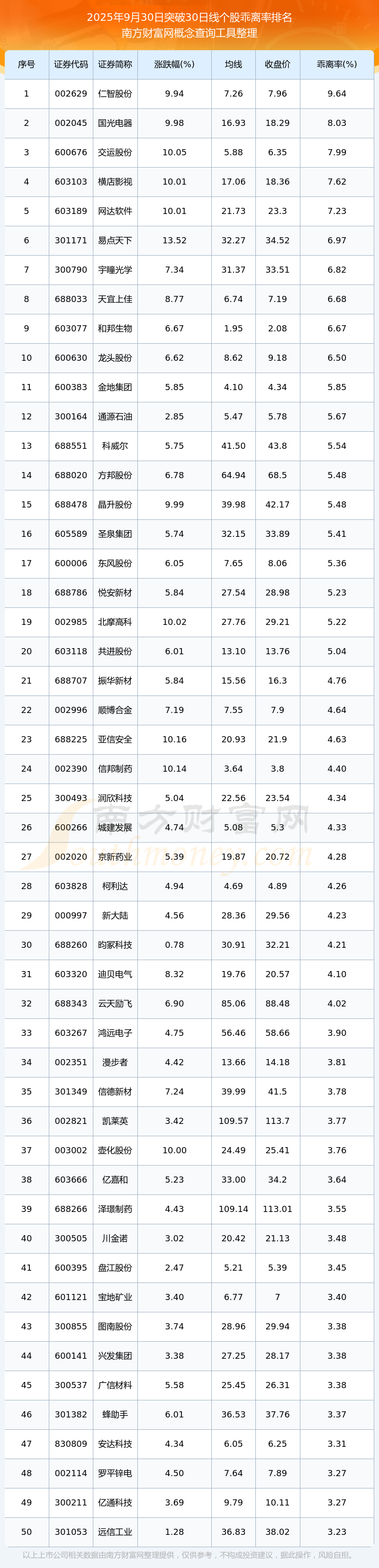 根據(jù)南方財富網(wǎng)概念查詢工具數(shù)據(jù)統(tǒng)計,截止2025年9月30日收盤,共有317只個股收盤價向上突破了30日線,其中乖離率較大的個股有仁智股份、國光電器、交運股份、橫店影視、網(wǎng)達軟件等,乖離率分別為9.64%、8.03%、7.99%、7.62%、7.23%。