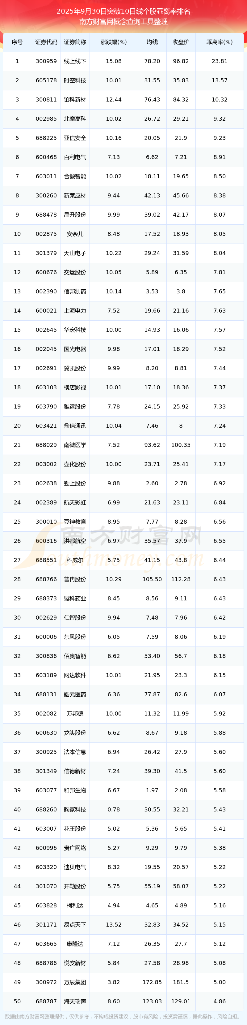 2025年9月30日突破10日線個(gè)股乖離率排名
