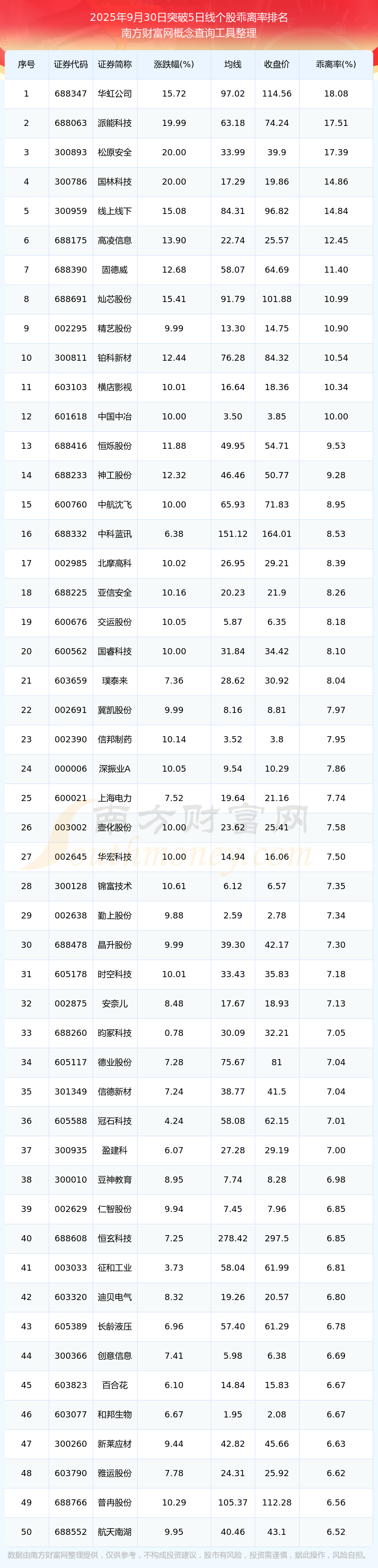 2025年9月30日突破5日線個股乖離率排名