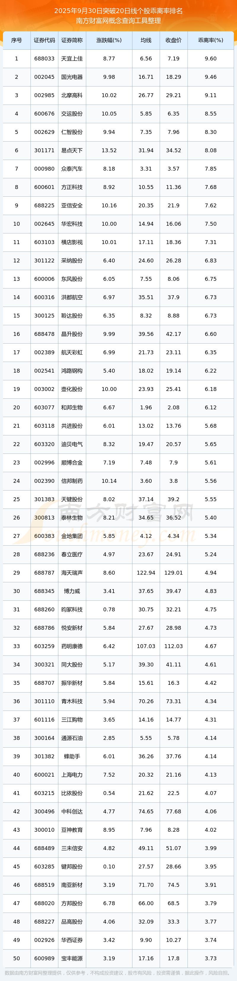 2025年9月30日突破20日線個股乖離率排名