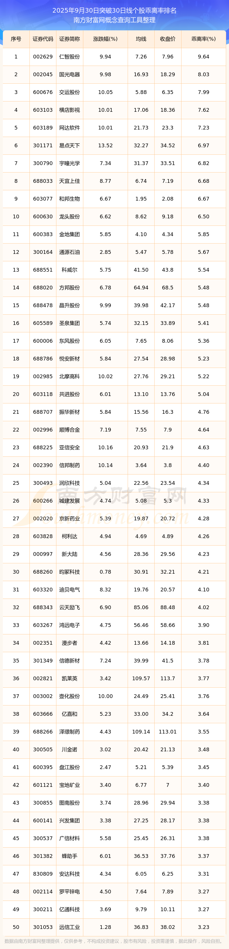 2025年9月30日突破30日線個(gè)股乖離率排名